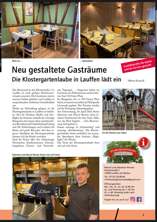 Bei uns ist der barrierefreie Zugang garantiert. Ihre Haustiere sind bei uns genauso willkommen. Am besten reservieren Sie heute noch einen Tisch. Wir freuen uns auf Sie. Wir stehen Ihnen per E-Mail unter infoklostergartenlaube@gmail.com zur Verfügung. Als Zahlungsmöglichkeiten akzeptieren wir EC-Karten, kontaktloses Bezahlen und Barzahlung. Wir bedienen auch Privatveranstaltungen. Für noch mehr Infos und Buchungen kontaktieren Sie uns bitte direkt. Wir bieten unsere Räumlichkeiten auch gerne für Hochzeiten oder andere Großveranstaltungen an. Melden Sie sich bei uns, wir helfen Ihnen, diesen ganz besonderen Tag nach Ihren Wünschen zu gestalten. Dienstag und Mittwoch sind bei uns Ruhetage. In den Sommerferien haben wir täglich geöffnet.